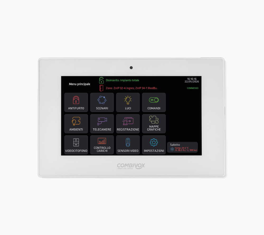 Tastiera-monitor da 7” touch screen per la gestione delle funzioni antifurto, domotica, videosorveglianza e videocitofonia; collegamento alla centrale tramite rete LAN (necessario modulo IP su centrale) /Wi-Fi (necessario modulo Wi-Fi WAN Combivox) o tramite BUS RS485 (dati+alimentazione) mediante interfaccia RS485 Connection (fornita in dotazione) per la gestione delle funzioni antifurto e domotica.